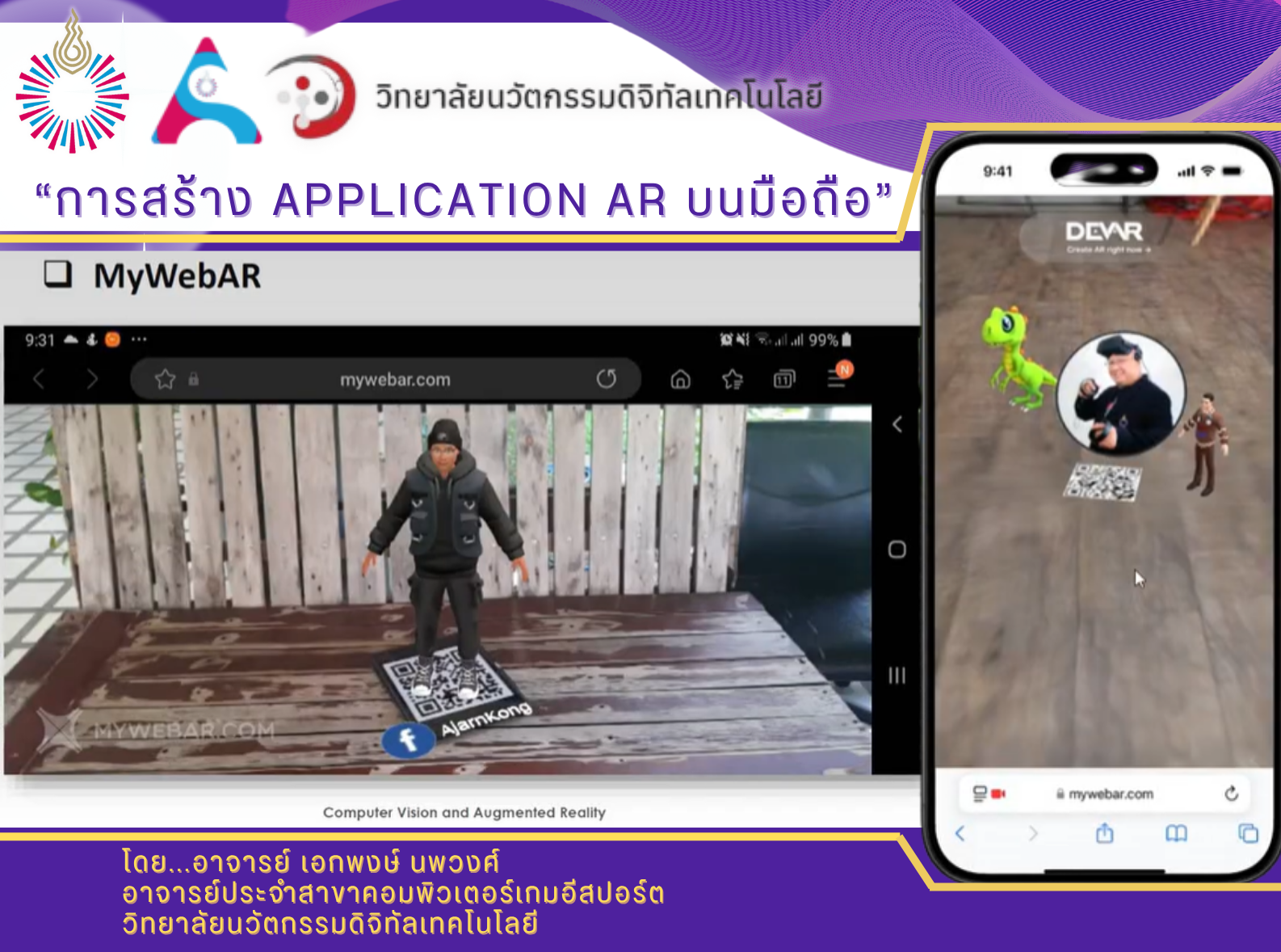 เป็นการแนะนำการสร้าง App AR (Augmented Reality) บนมือถือโดยใช้ QR Code เป็นตัวกระตุ้น (Marker) โดยเมือนำกล้องมือถือสแกน QR Code จะมีวัตถุเสมือน (เช่น ภาพ 3 มิติ, วิดีโอ, หรือข้อความ) แสดงขึ้นมาทับบนหน้าจอในโลกจริง
